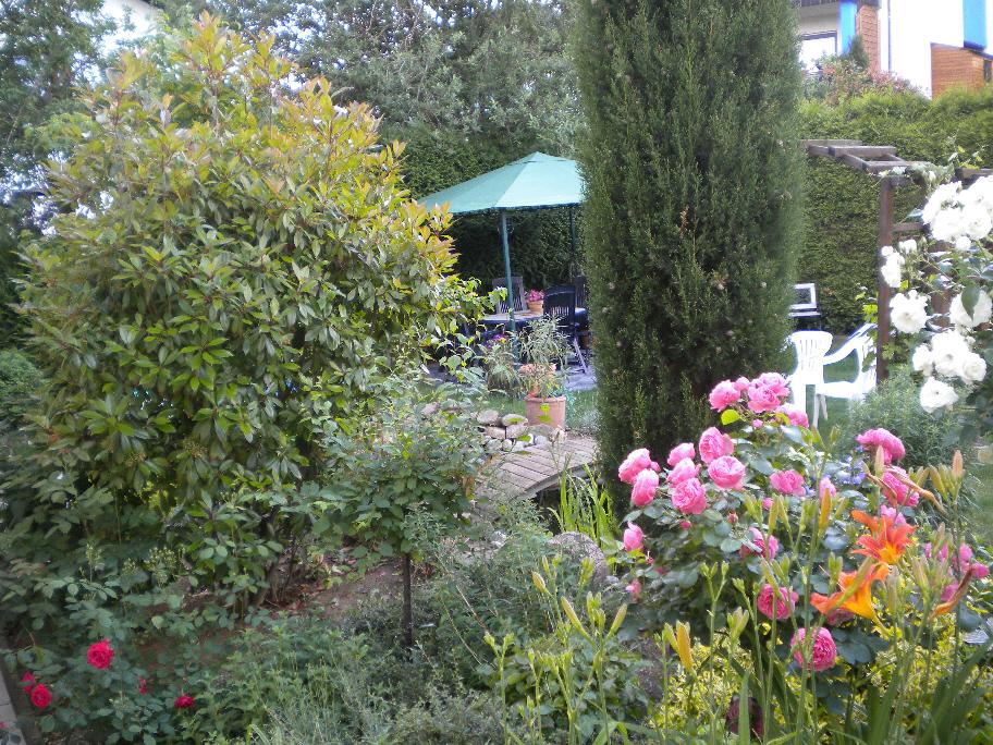 Mitten im Grünen: großzügig, liebevoll angelegt und herrlich ruhig im Ortskern gelegen, bietet unser Garten Ihnen die Möglichkeit, die milden Abende bei einem guten Glas Pfälzer Wein ausklingen zu lassen.